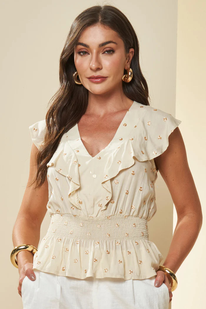 Essa blusa é a escolha perfeita para quem busca leveza e charme em um look casual ou sofisticado. Confeccionada em malha flame, ela traz um toque de textura delicada que combinado ao poá bordado em relevo dourado, adiciona feminilidade e originalidade à peça. 20% POLIESTER 80% VISCOSE
