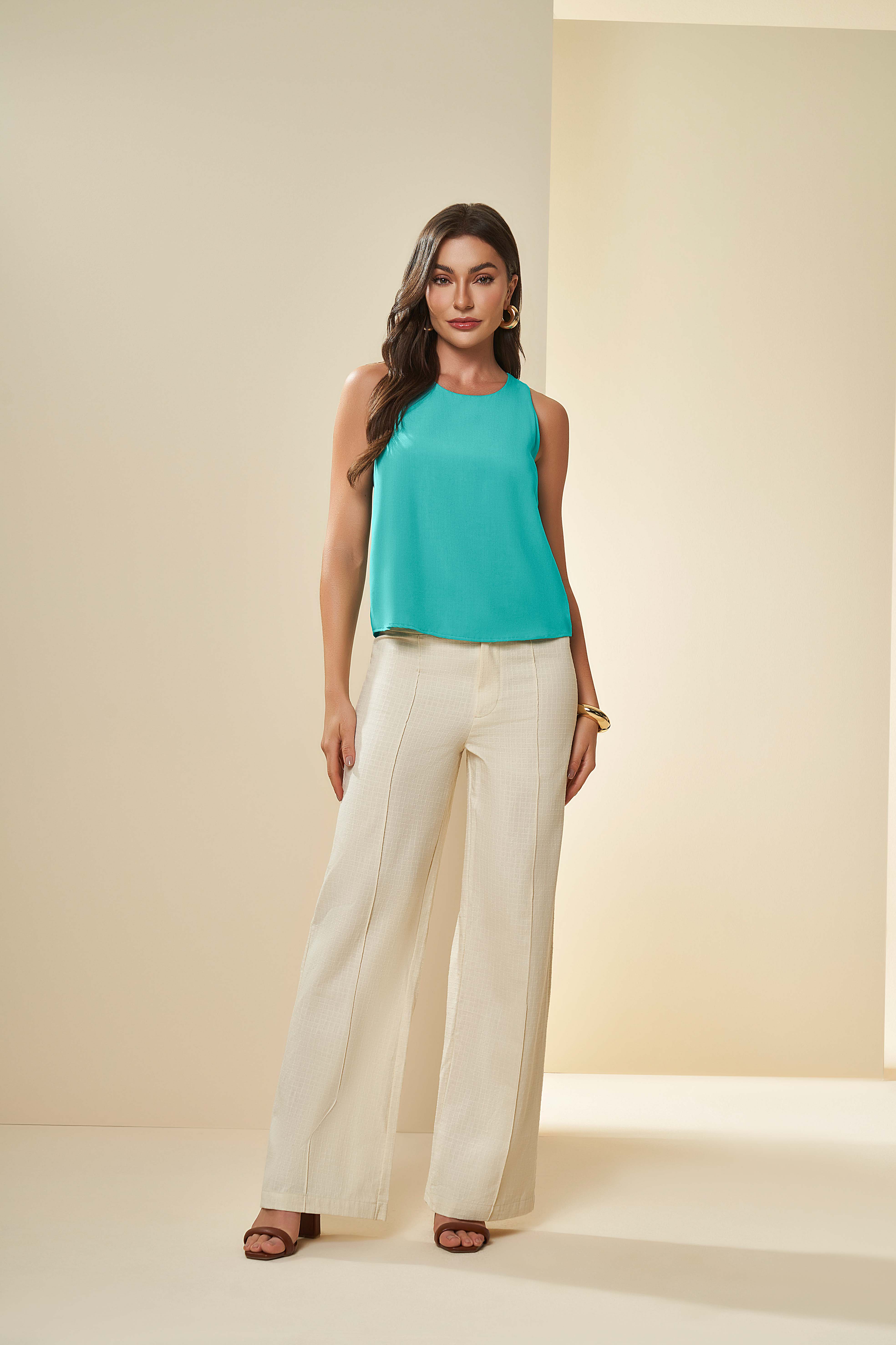Cor que domina a cena. Blusa sem mangas em viscose azul turmalina que traz profundidade e magnetismo a qualquer composição. O tecido fluido em plano oferece movimento elegante e caimento impecável, enquanto a ausência de mangas proporciona leveza e modernidade. Uma peça versátil que funciona tanto em looks minimalistas quanto em combinações mais ousadas. Essencial para quem quer fazer declarações de estilo com confiança.