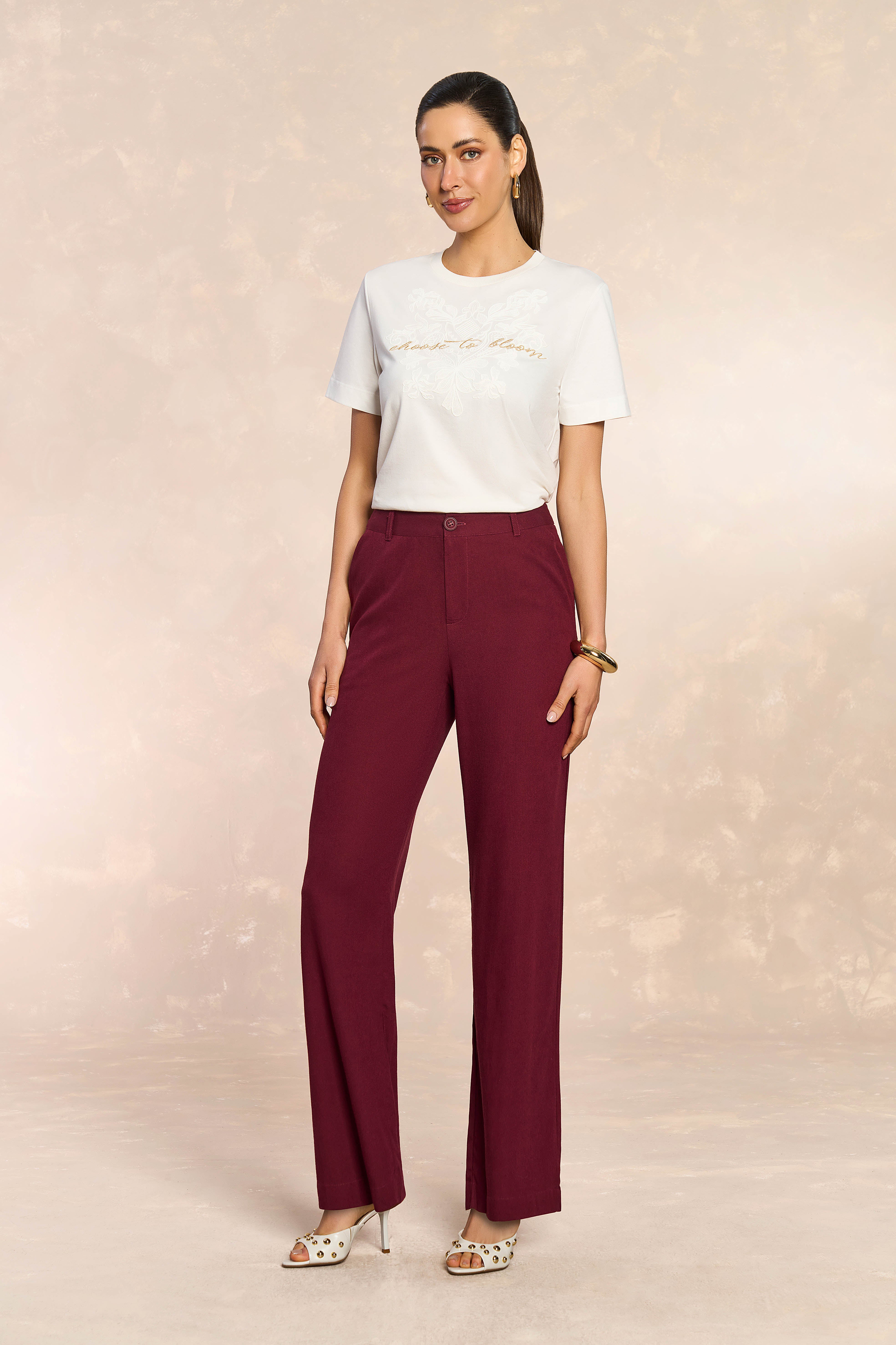 Calça feminina confeccionada em linho plano, oferecendo conforto e elegância para o dia a dia. O tom merlot traz sofisticação e versatilidade, combinando facilmente com diferentes peças do guarda-roupa. Ideal para criar looks casual ou mais refinados, a peça destaca-se pela qualidade do tecido natural que proporciona respirabilidade e durabilidade. Perfeita para quem busca estilo e praticidade em uma única peça.