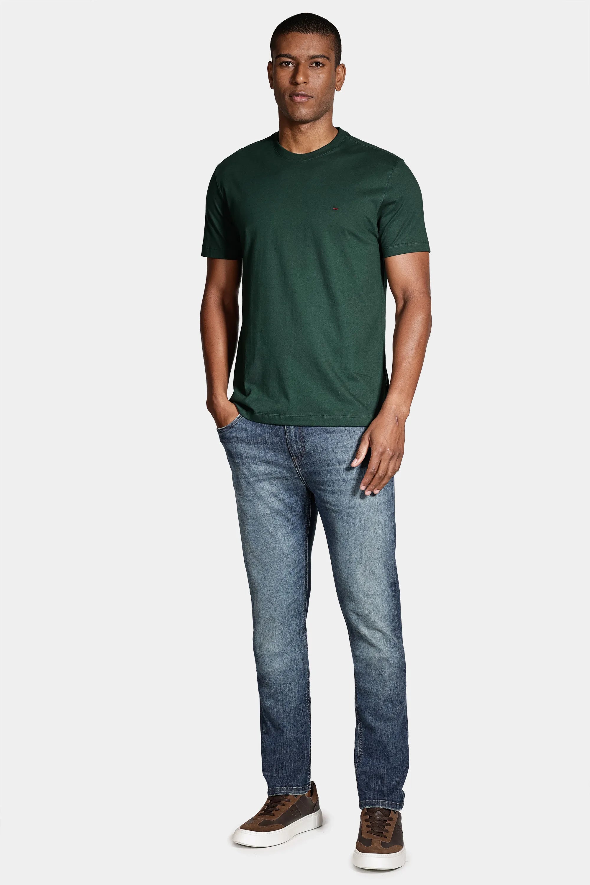 A calça jeans é uma peça moderna e versátil, ideal para compor diversos looks. Confeccionada em uma mistura de algodão, e elastano, possui modelagem slim, ligeiramente ajustada ao corpo. O cós possui passantes, permitindo o uso de cintos, enquanto os bolsos frontais e posteriores oferecem funcionalidade e estilo, a etiqueta com o logotipo gravado em baixo relevo acrescenta um toque de sofisticação e o fechamento frontal é feito por zíper e botão, garantindo um encaixe seguro.