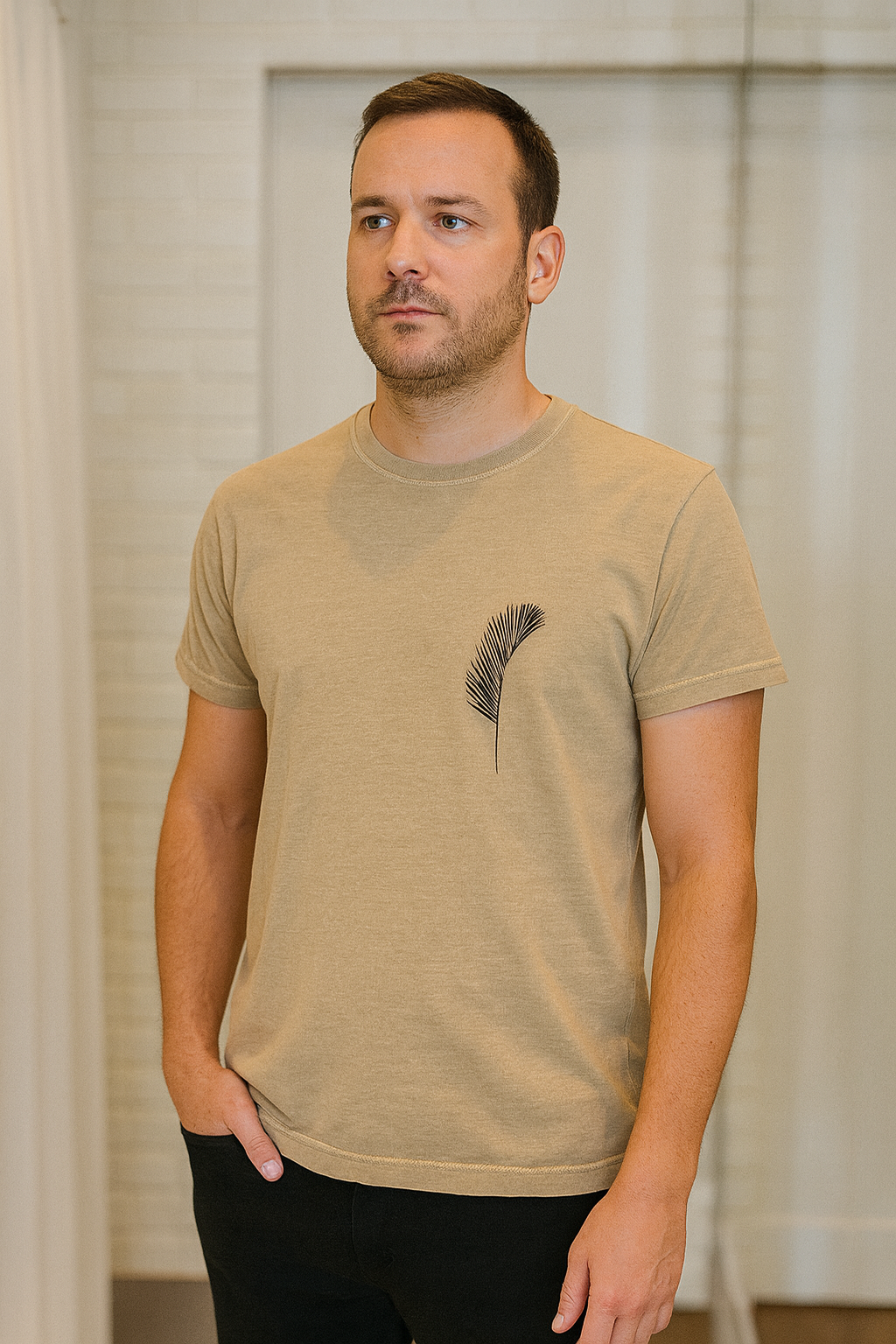 Camiseta masculina de manga curta Stone Folha Palmeira Osklen em caqui, tom natural que evoca liberdade e aventura. Estampa tropical discreta que traz movimento sem ser excessiva, funcionando em looks casuais com personalidade. Tecido de qualidade que oferece conforto respirável e durabilidade. Para quem tem coragem de explorar tons terrosos e se conectar com um estilo mais autêntico e descontraído.