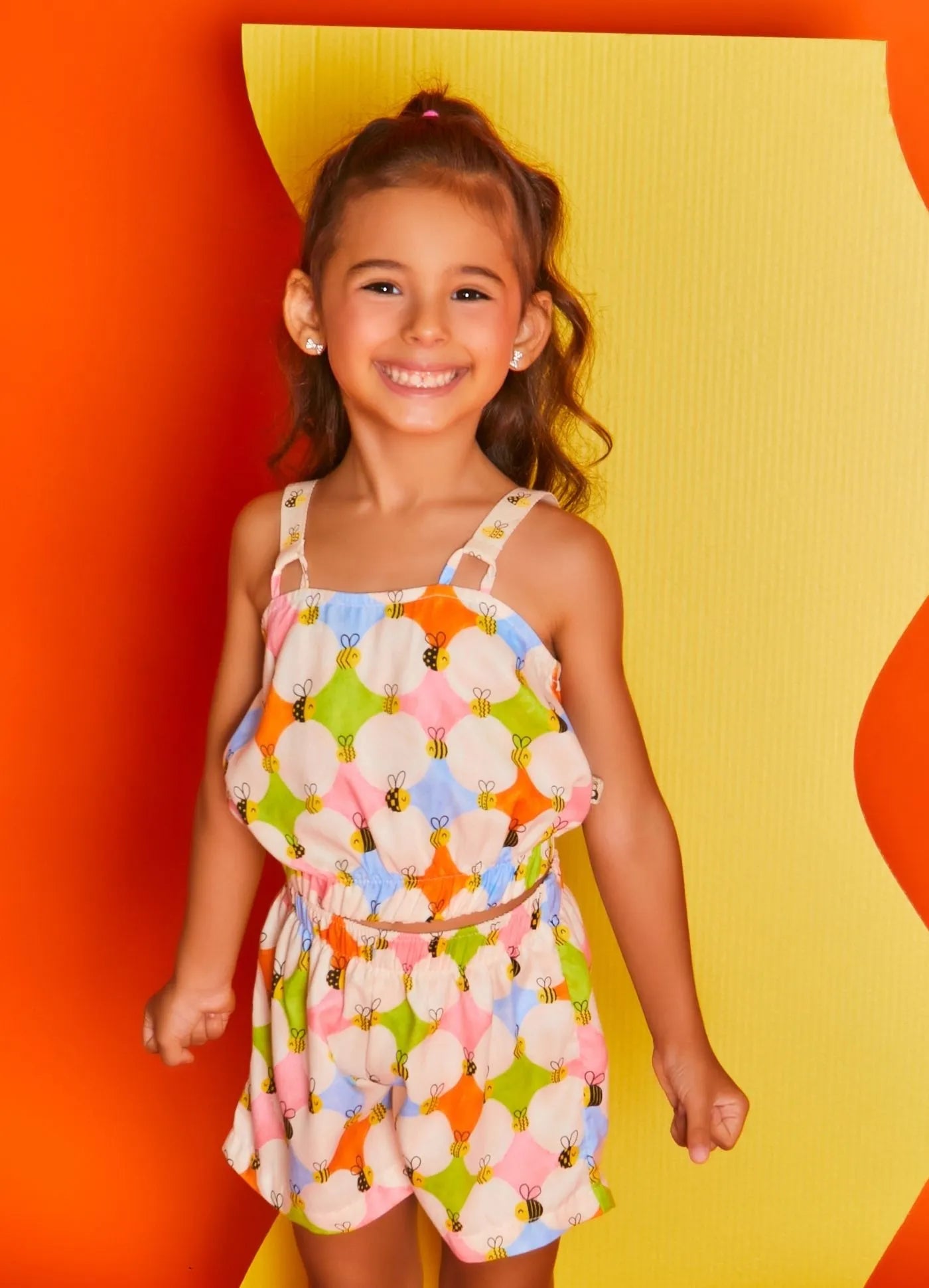 Para brincar e passear com estilo! O conjunto infantil Abelhinhas é composto por bata e short.