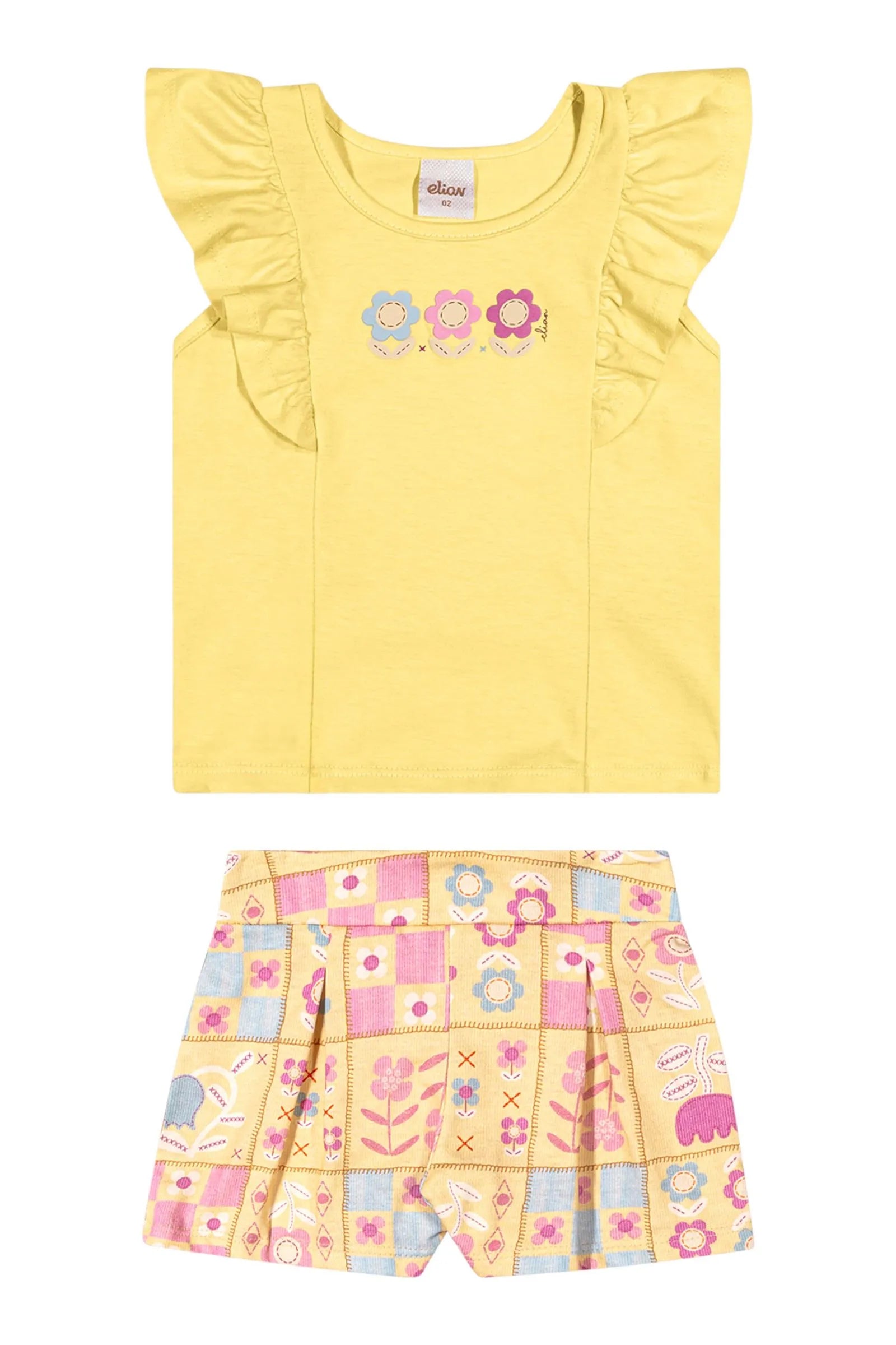 Conjunto feminino infantil com blusa estampada de flores e short floral amarelo, perfeito para os dias ensolarados. O tecido leve e confortável permite que as crianças brinquem com liberdade, enquanto as estampas alegres trazem charme e frescor ao visual. Uma escolha delicada e divertida para as pequenas aproveitarem cada momento com estilo.