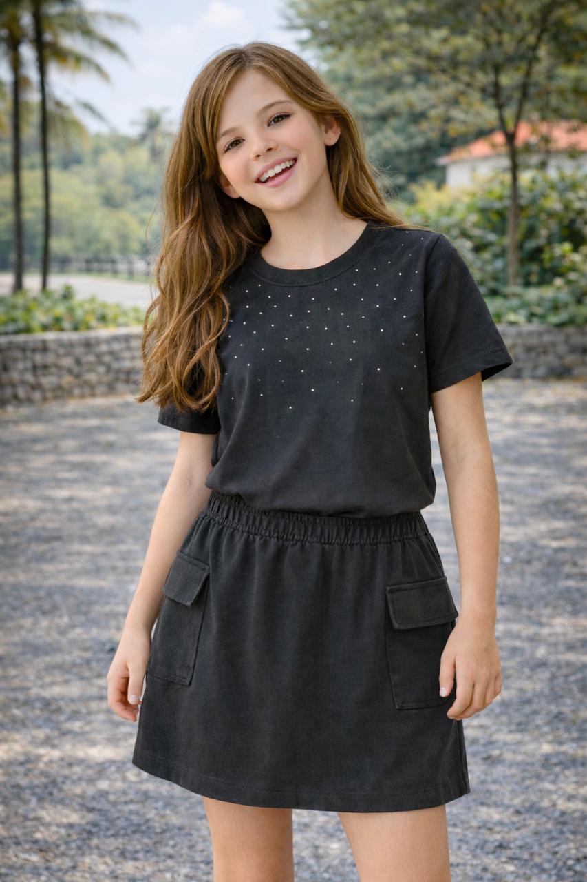 Conjunto feminino brilhante com blusa strass e short-saia multicolorido! Na cor preta sofisticada, a blusa traz um toque de glamour com os detalhes em strass que brilham e chamam atenção. O short-saia multicolorido adiciona diversão e movimento ao visual, criando um contraste perfeito entre elegância e descontração. Os bolsos práticos oferecem funcionalidade para as meninas guardarem seus pequenos tesouros. O tecido oferece conforto máximo para brincar, correr e se divertir o dia todo. Perfeito para ocasiões especiais, festas ou quando quer se sentir especial, este conjunto une estilo, brilho e conforto. Uma peça que as meninas vão amar usar e que as faz se sentir princesas!