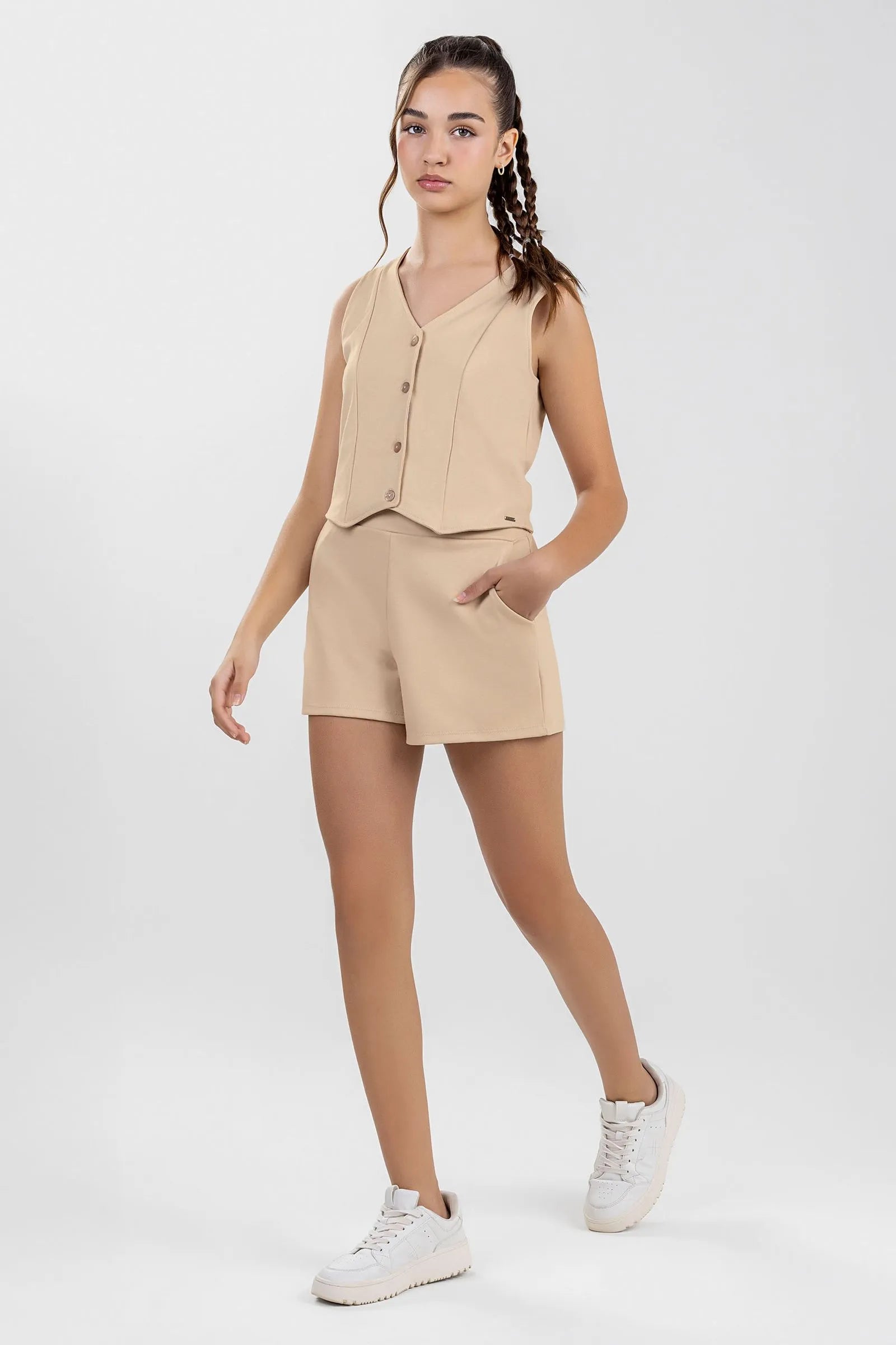 Conjunto feminino juvenil com colete e short em ponto roma na cor bege. A peça é confortável e elegante, ideal para as jovens que querem um look delicado e prático para o dia a dia. O tecido macio garante liberdade para brincar e se movimentar com charme e estilo.