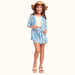 Conjunto infantil feminino com kimono e short em tons de azul e branco, estampado com abacaxi. Perfeito para dias quentes, oferece conforto e estilo para as meninas. O kimono leve combina com o short, criando um visual descontraído e divertido. Ideal para passeios, praia ou uso casual do dia a dia.
