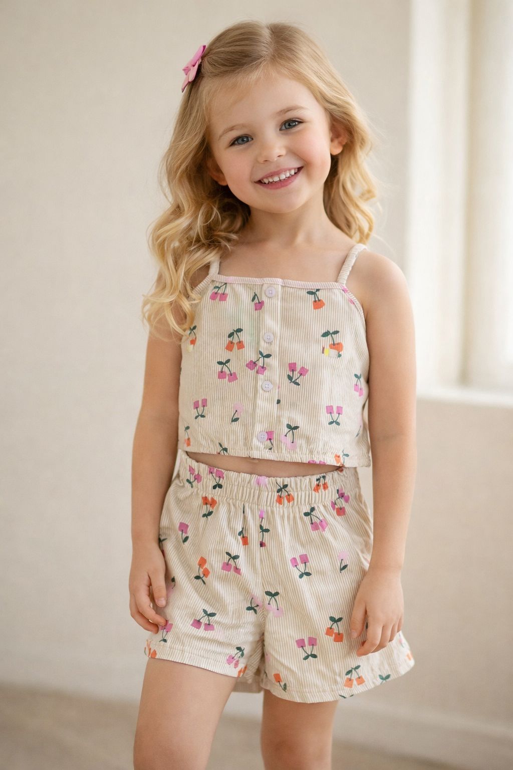 Conjunto feminino infantil em malha listrada com estampa de frutinhas, composto por regata e short coordenados. Confeccionado em tecido macio e leve, garante conforto máximo para as brincadeiras e atividades do dia a dia. A paleta off-white neutra oferece versatilidade para criar diferentes composições, enquanto o padrão alegre adiciona um toque de personalidade. Uma opção prática e elegante que combina funcionalidade com estilo refinado para o guarda-roupa infantil.