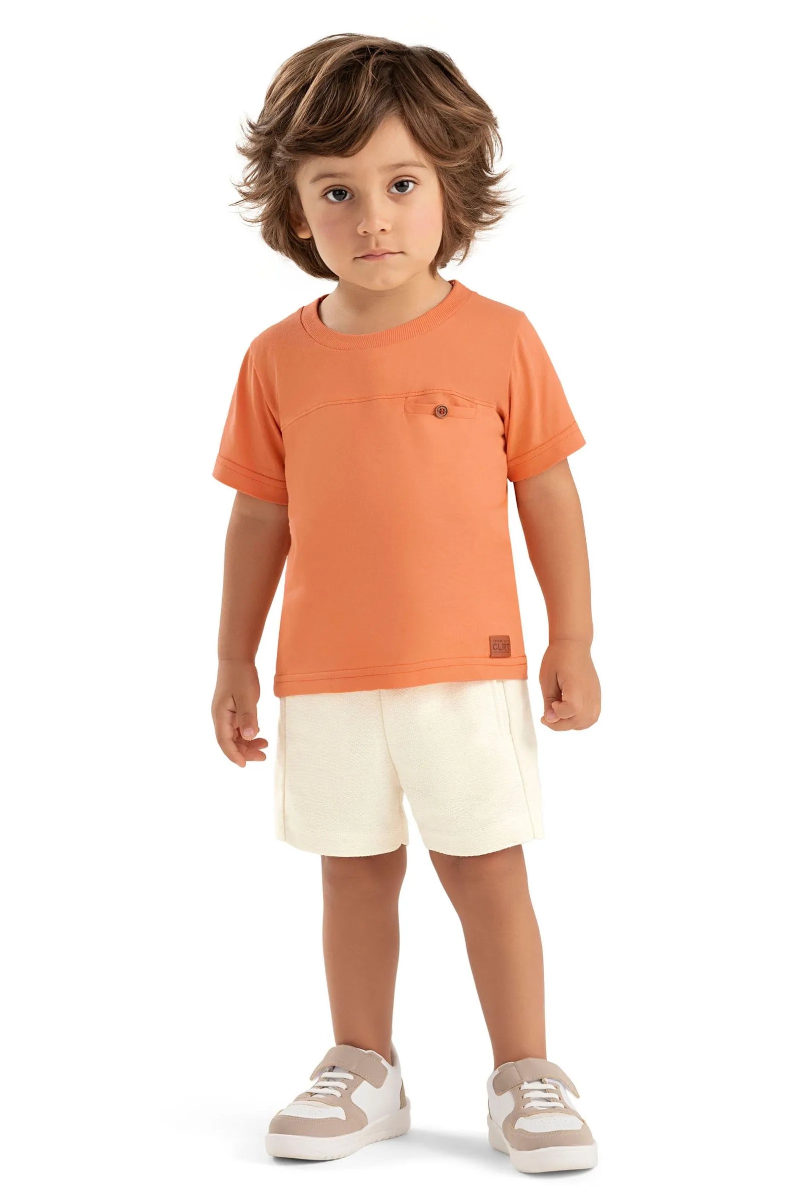 Este conjunto masculino infantil em laranja vibrante combina uma camiseta com bolso fake e bermuda em malha de linho, proporcionando leveza e conforto para as brincadeiras. Cheio de estilo e cor, é perfeito para os pequenos exploradores cheios de energia e diversão.