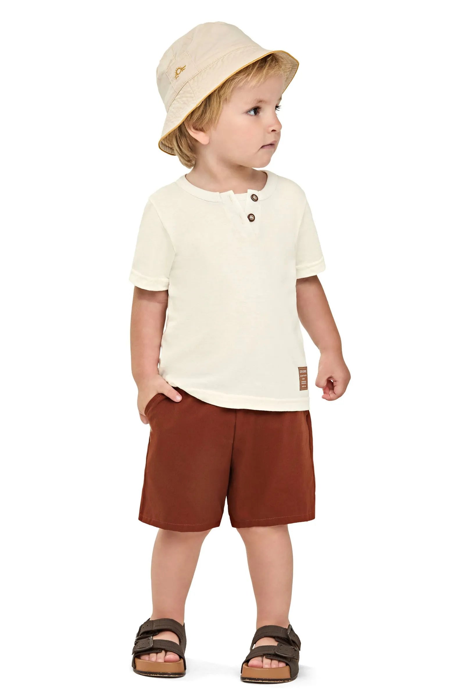 O Conjunto Elian é composto por camiseta em meia malha e bermuda em sarja. A camiseta de mangas curtas possui recorte no decote com sobreposição e detalhes em botões no peitilho, trazendo um toque moderno para o look. Já a bermuda conta com elástico no cós e bolsos laterais, oferecendo muita praticidade. Ideal para ocasiões que pedem um visual mais arrumado, esse look garante charme e conforto para os meninos.