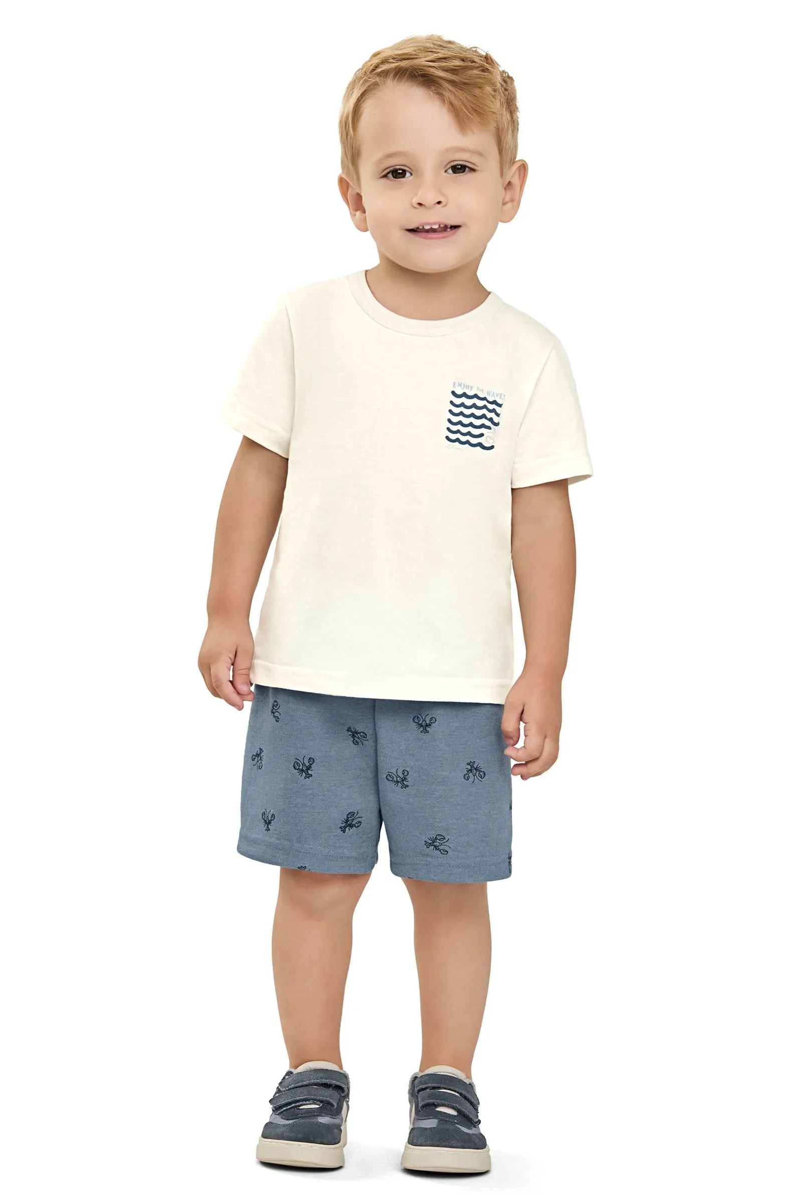 O Conjunto Elian é composto por camiseta em meia malha e bermuda em moletinho dublado. A camiseta de mangas curtas possui estampa discreta com ondas e uma lagostinha, além da frase "Enjoy The Waves" (Aproveite as Ondas), trazendo um toque moderno ao visual. Já a bermuda conta com elástico no cós e estampa combinando com a camiseta. Ideal para dias de passeio, esse conjunto prático e cheio de estilo é a opção perfeita para compor o guarda-roupa dos meninos.