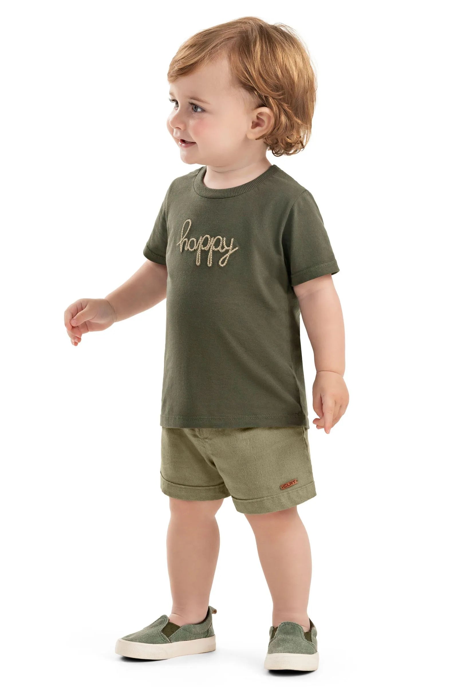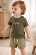 Este conjunto masculino infantil em verde militar combina uma camiseta com estampa "Happy" e bermuda em linho rústico, oferecendo conforto e resistência para o dia a dia. Ideal para acompanhá-los nas aventuras com segurança e estilo acolhedor, trazendo liberdade para se movimentar com tranquilidade.