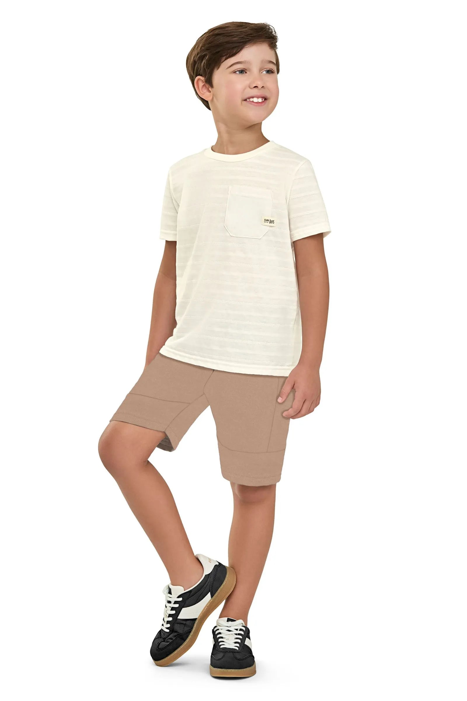 O Conjunto Elian é composto por camiseta em malha rajada e bermuda em moletinho. A camiseta de mangas curtas possui um efeito listrado em toda a peça e bolso frontal, garantindo um visual mais charmoso. Já a bermuda conta com elástico no cós e detalhes em recortes. Ideal para passeios e momentos em família, aposte nesse look completo para trazer conforto e estilo para o guarda-roupa dos meninos!