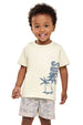 Este conjunto infantil off-white traz uma camiseta com estampa de surf e bermuda de linho estampada, unindo conforto e estilo. Ideal para manter as crianças frescas e à vontade durante os dias quentes, garantindo liberdade de movimento com um toque moderno.
