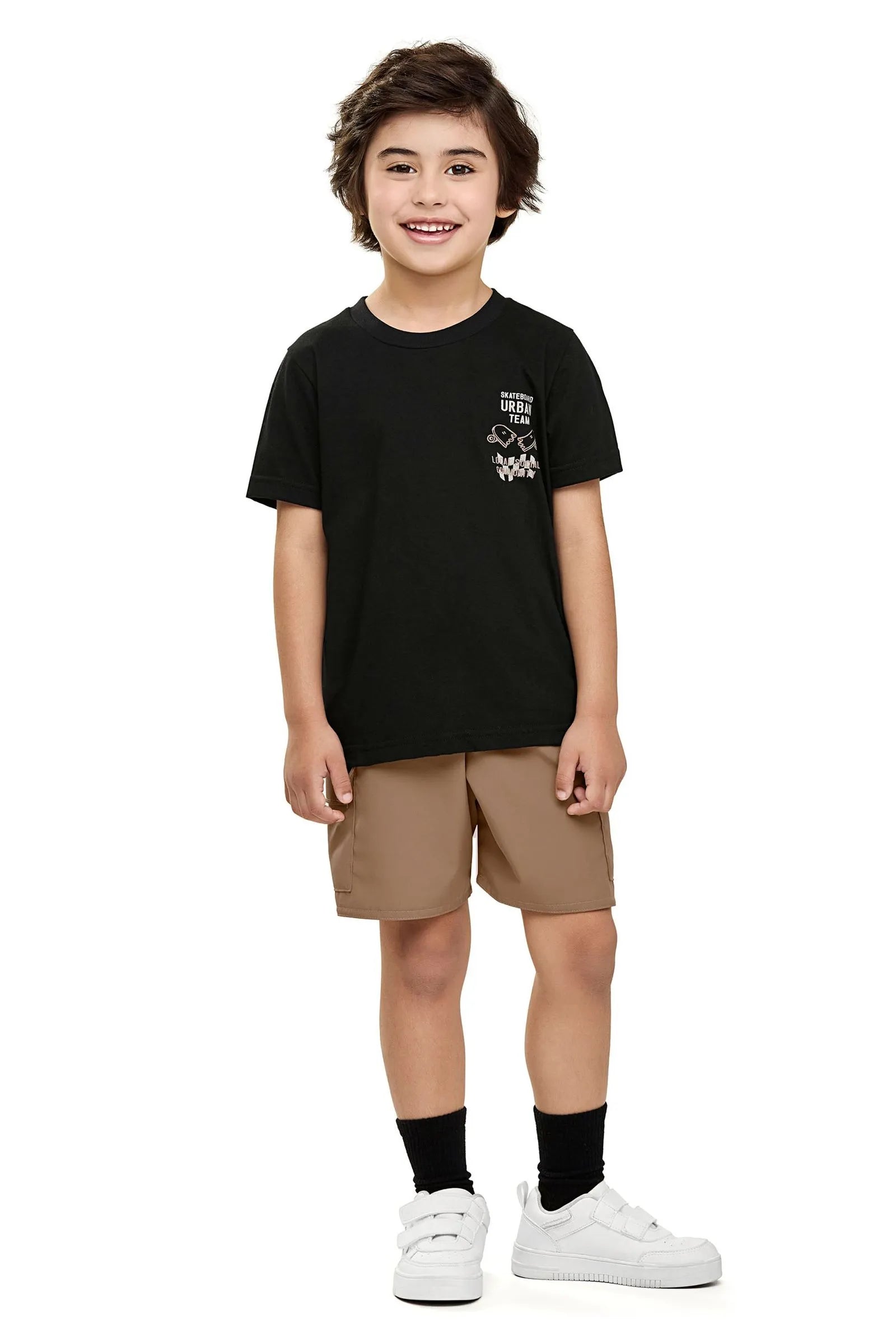 Este conjunto infantil preto traz uma camiseta com estampa "Urban Team" cheia de atitude e uma bermuda em microfibra superconfortável. Perfeito para as aventuras do dia a dia, combina estilo e liberdade para brincar sem parar!