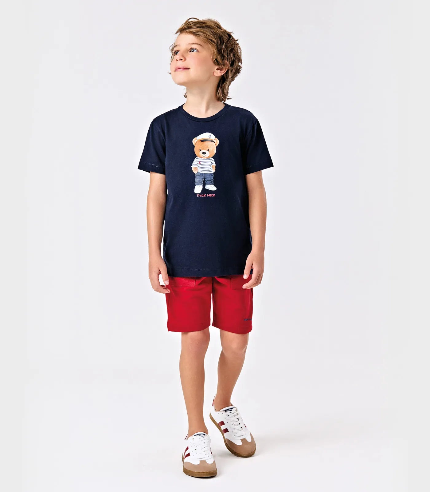 Conjunto infantil com camiseta estampada com ursinho marinheiro e bermuda listrada em tons de azul marinho. Perfeito para os pequenos navegadores, oferece conforto e estilo para acompanhar as brincadeiras e aventuras do dia a dia. Fácil de vestir e combinar, é a escolha ideal para momentos divertidos.