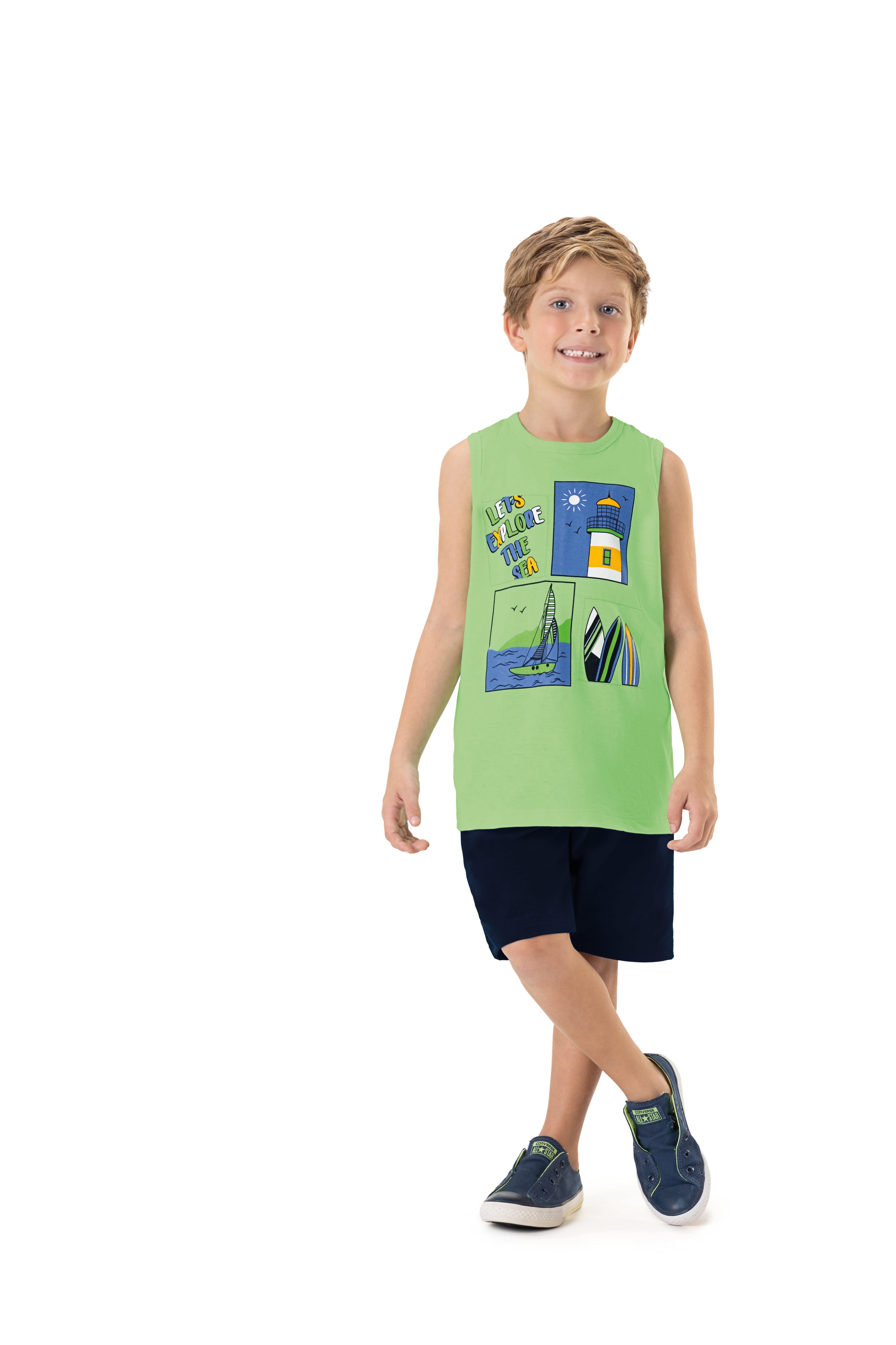 Conjunto infantil com regata estampada de farol e barco, combinando com bermuda multicolorida em verde neon. Ideal para os pequenos que gostam de conforto e diversão, essa combinação traz estilo vibrante e liberdade para as brincadeiras do dia a dia.