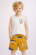 O Conjunto Elian é composto por regata em malha flamê e bermuda em moletinho. A regata possui um efeito diferenciado e uma discreta estampa de barquinho inspirada em desenhos com giz de cera, acompanhada da frase "Great Adventure Across The Ocean" (Grande Aventura Através do Oceano). Já a bermuda conta com elástico no cós e estampa combinando com a regata. Perfeito para brincadeiras em dias de sol, esse conjunto é a aposta certa para garantir conforto e estilo no dia a dia dos meninos!