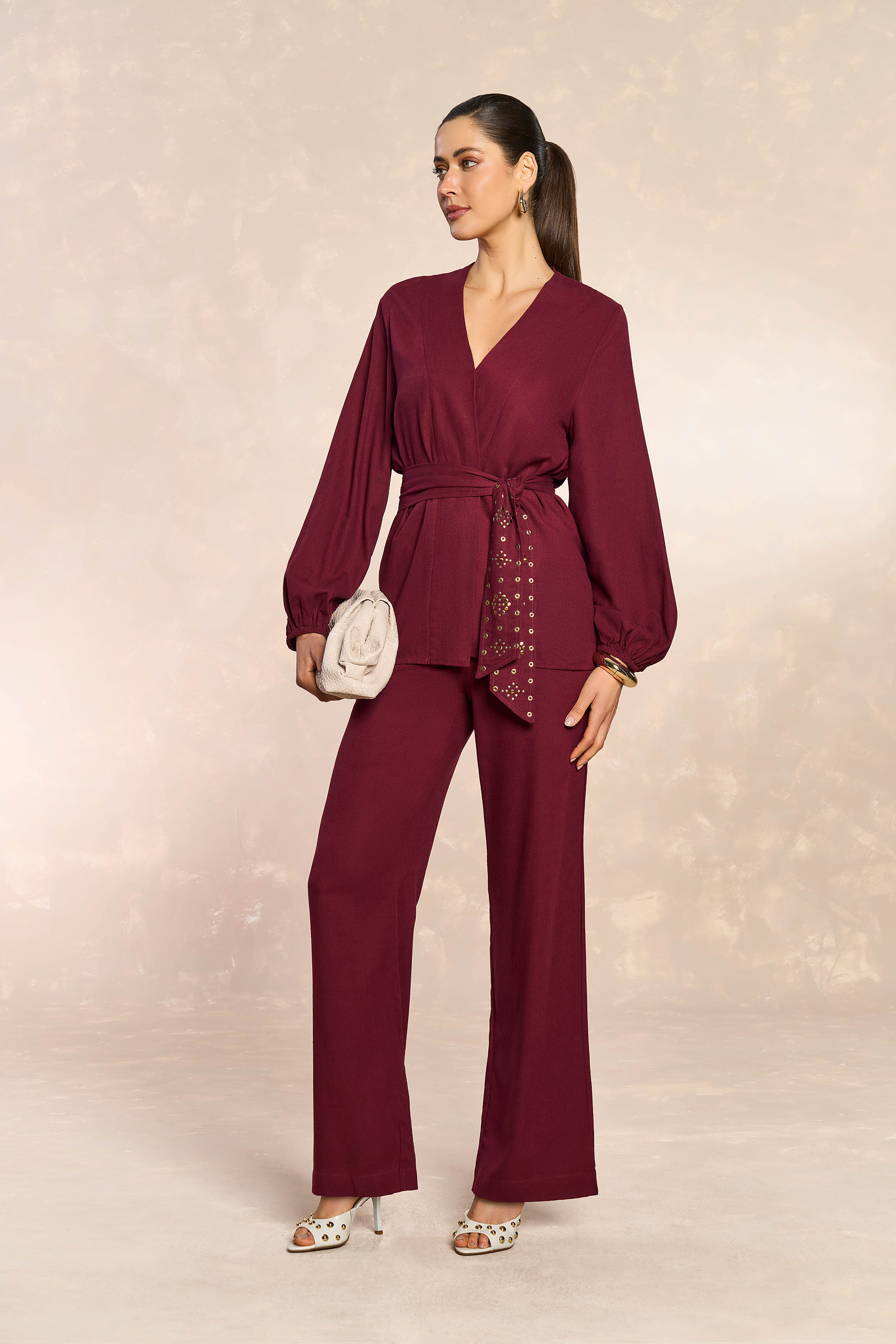 Kimono feminino em linho plano com manga longa, na cor merlot sofisticada. Peça versátil que combina conforto e elegância, ideal para looks casuais ou mais elaborados. O tecido linho oferece respirabilidade e toque natural, perfeito para o clima tropical. Corte fluido que valoriza o corpo e proporciona liberdade de movimento. Uma escolha atemporal para quem busca estilo e praticidade no guarda-roupa.
