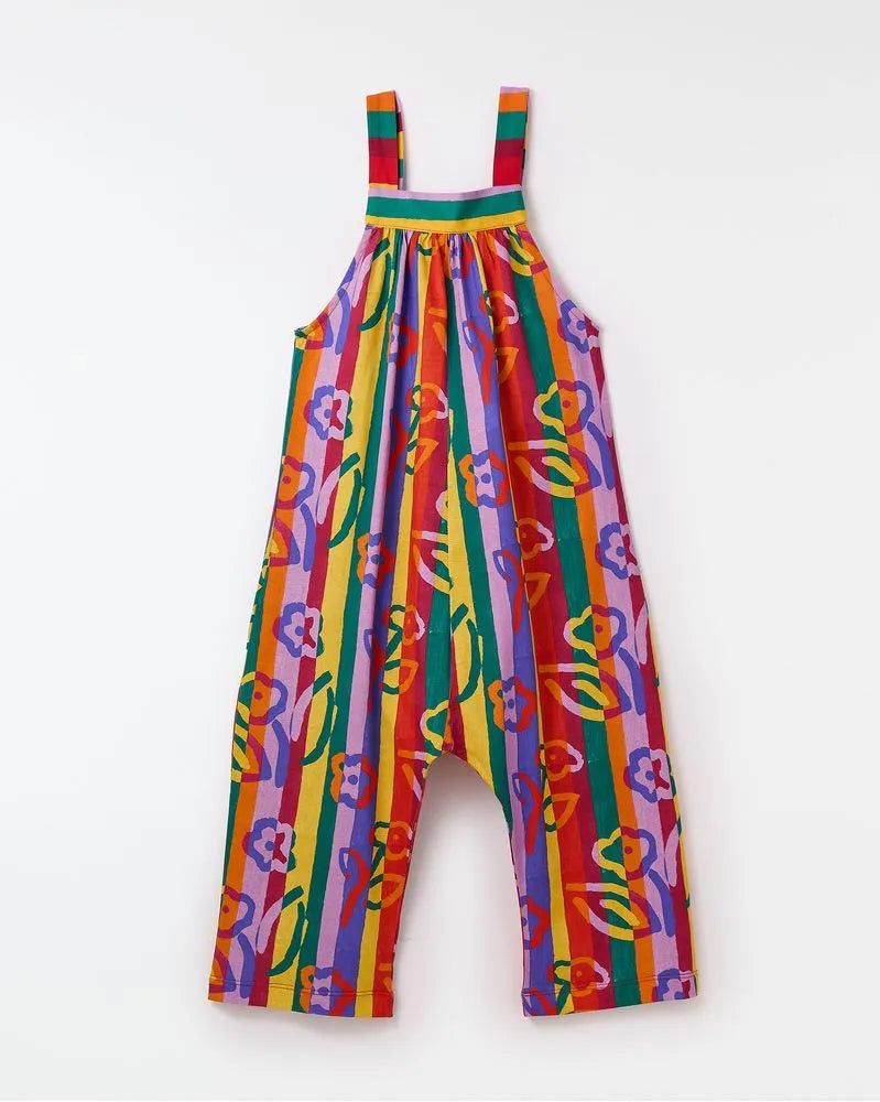 Macacão infantil desenvolvido em malha de algodão com alças reguláveis por amarração, decote reto e as listras coloridas da estampa Flor de Rayas.