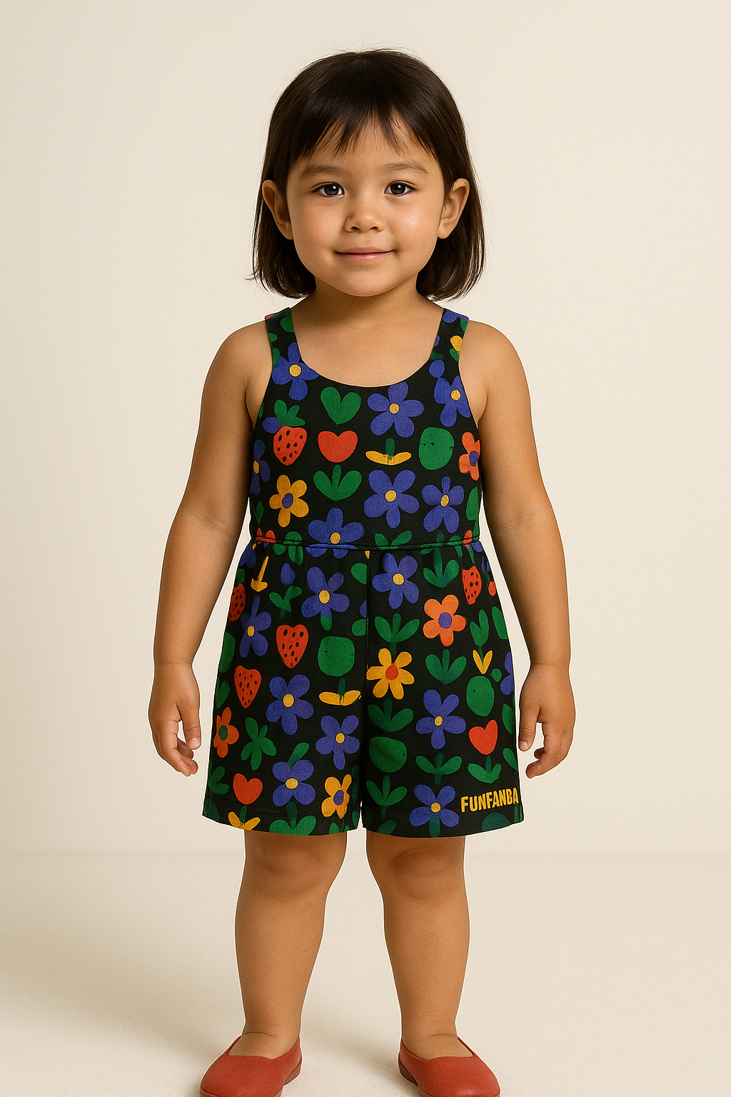 Macaquinho infantil desenvolvido em malha de algodão com decote em U, alças reguláveis por amarração nas costas, recorte com franzidos na cintura e os desenhos de flores coloridas da estampa Jardinzin.