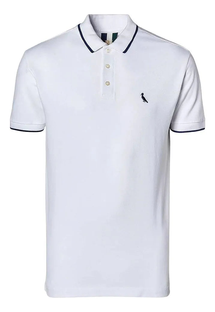 Polo masculina branca com corte enxuto, destacando-se pelo design minimalista e o detalhe de um único friso que confere sofisticação discreta à peça. Fabricada para oferecer ajuste elegante e conforto, é ideal para compor looks contemporâneos com requinte e simplicidade.