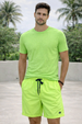 Short masculino em tactel liso, combinando verde neon vibrante com detalhes em marinho. Tecido respirável e de secagem rápida, perfeito para quem não abre mão de estilo mesmo em dias quentes. A paleta de cores ousada garante destaque garantido, enquanto o corte moderno oferece conforto total para atividades do dia a dia ou momentos de lazer.