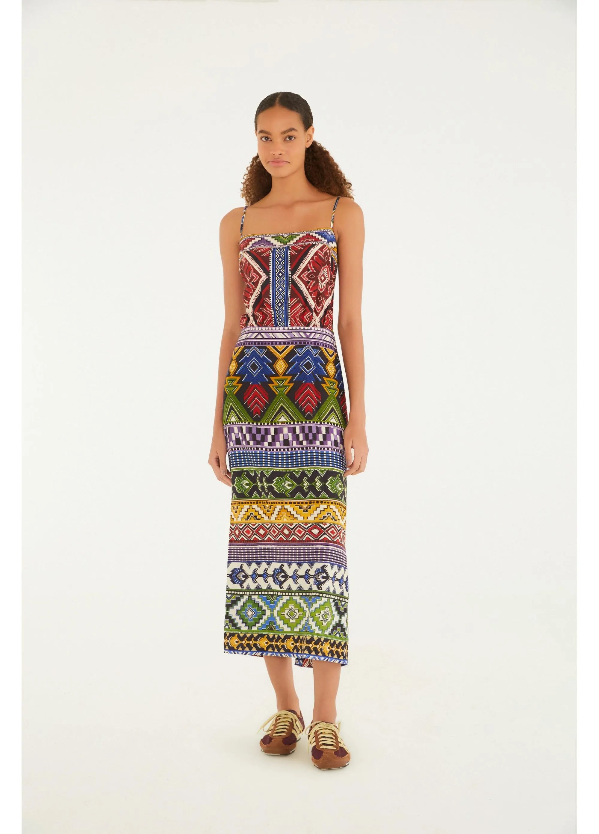 vestido alcinhas estampado gráfico de cor. apresenta alças finas e decote reto que se somam ao design leve e cheio de personalidade. com modelagem ajustada ao corpo e comprimento midi, é ideal para dias casuais ou eventos especiais. a estampa gráfica traz um toque de arte e originalidade. FARM RIO original - alto inverno 25.