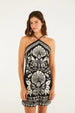 vestido curto estampado sintra. possui decote halter com alças cruzadas, destacando o pescoço de forma delicada. o corte é ajustado no busto com caimento solto, proporcionando leveza nos movimentos. ideal para ocasiões casuais que pedem charme único e autêntico. FARM RIO original - alto verão 26.