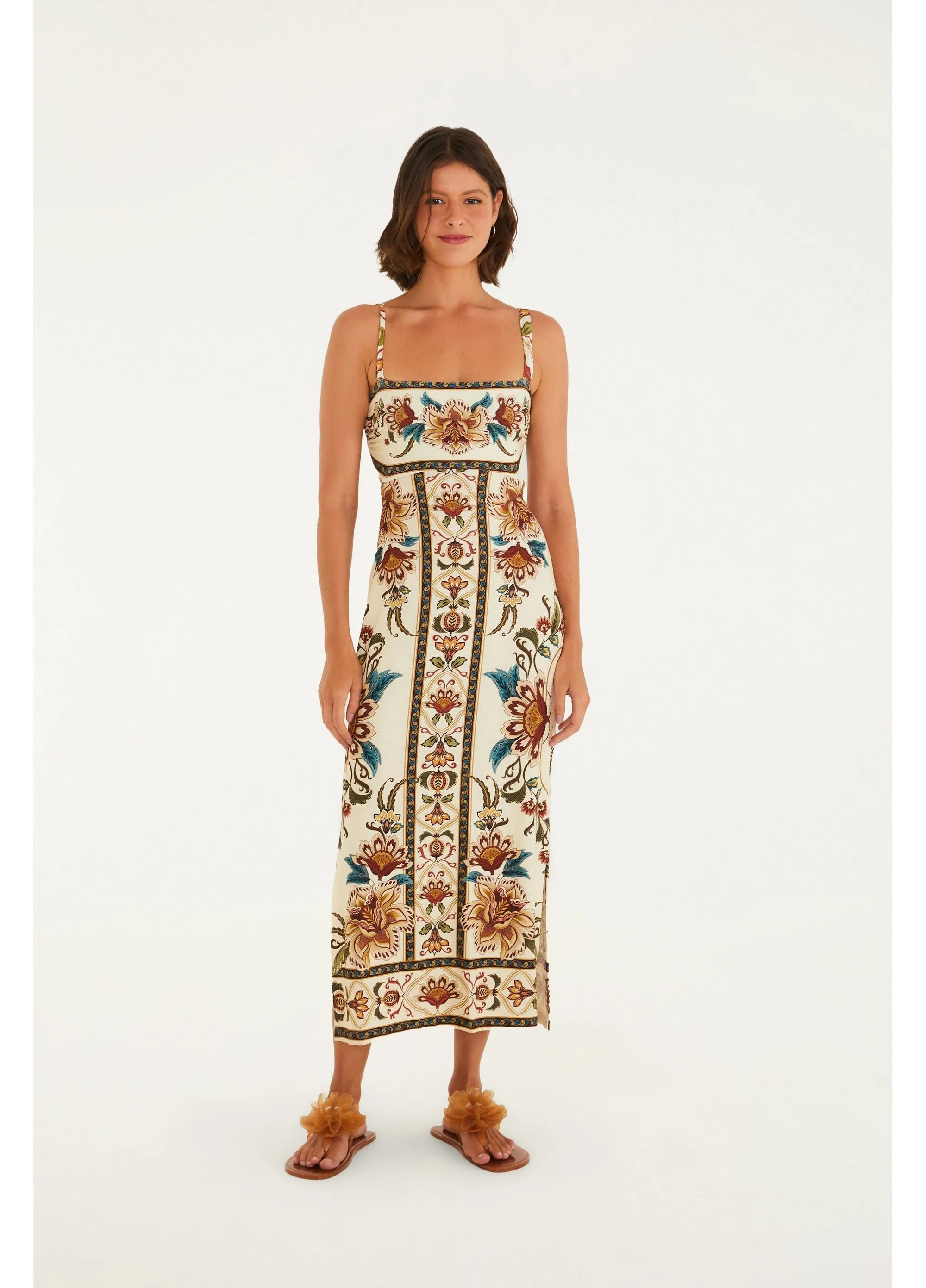 vestido midi estampado jardim majestoso. com decote quadrado e alças finas, a modelagem reta e comprimento midi garantem um visual casual e ao mesmo tempo charmoso. perfeito para ocasiões casuais, passeios ao ar livre ou encontros especiais. acabamento delicado traz um toque de ex
