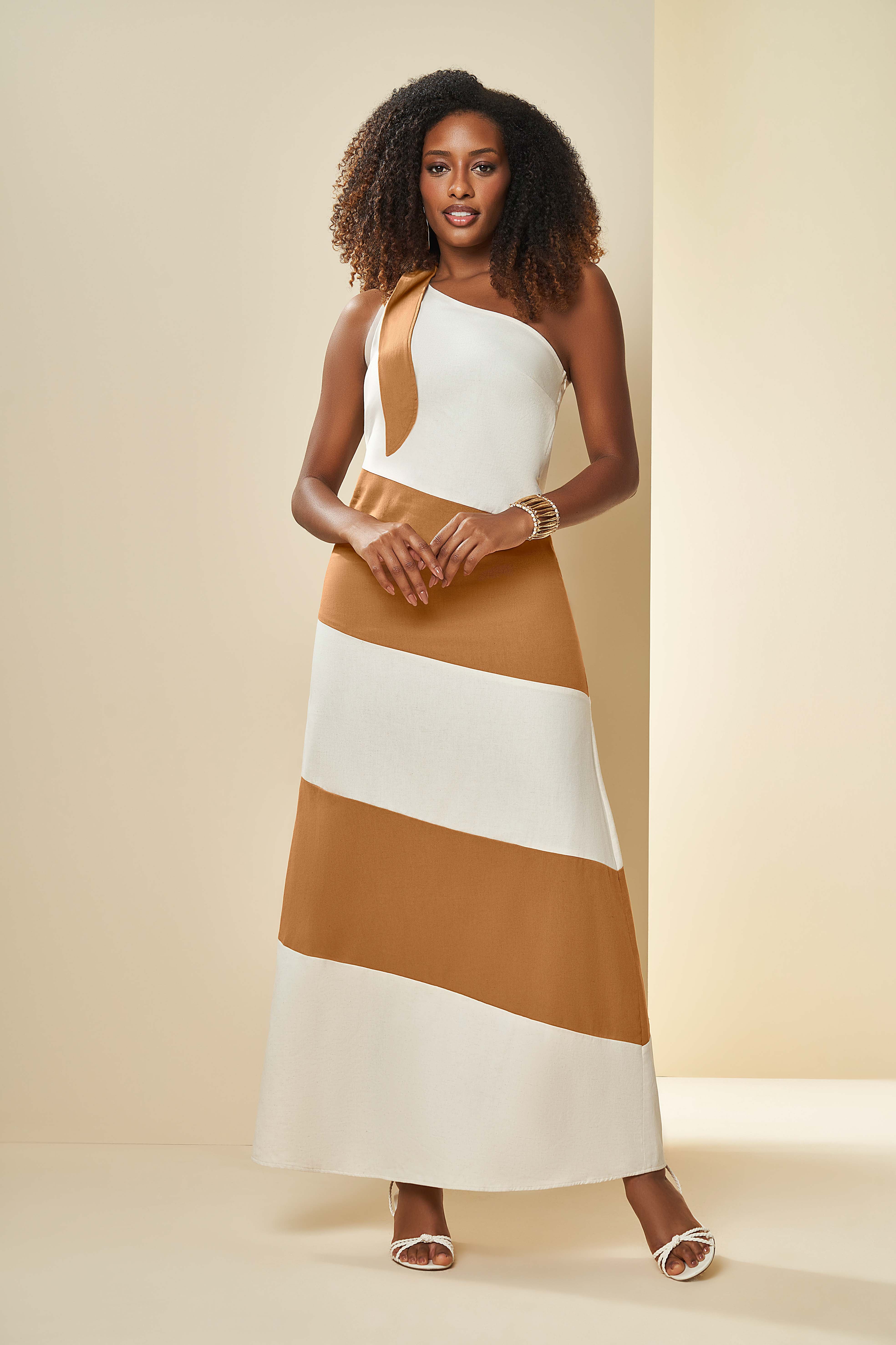 Este vestido longo sem mangas em viscolinho com listras nas cores natural e mascavo combina conforto e elegância com seu tecido leve e textura suave. Seu design fluido valoriza a silhueta, proporcionando um visual sofisticado e contemporâneo, ideal para eventos formais ou ocasiões especiais.