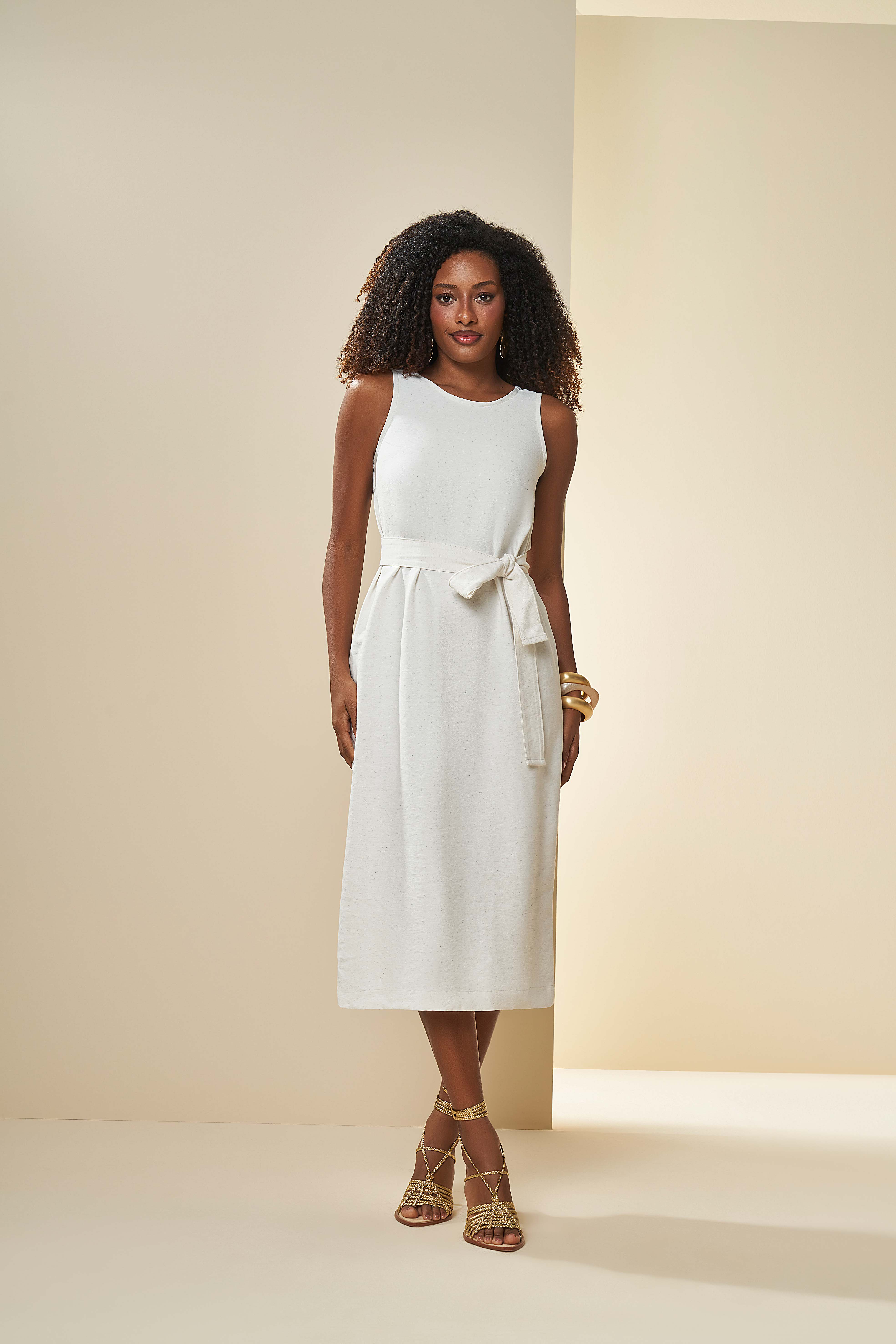 O vestido midi sem mangas em tecido plano Marant Linen natural alia simplicidade e sofisticação com um caimento elegante. Sua textura suave e cor neutra promovem versatilidade, tornando-o ideal para composições refinadas em diversas ocasiões. Essa peça é o equilíbrio perfeito entre conforto e estilo contemporâneo, destacando-se pela delicadeza e sobriedade.