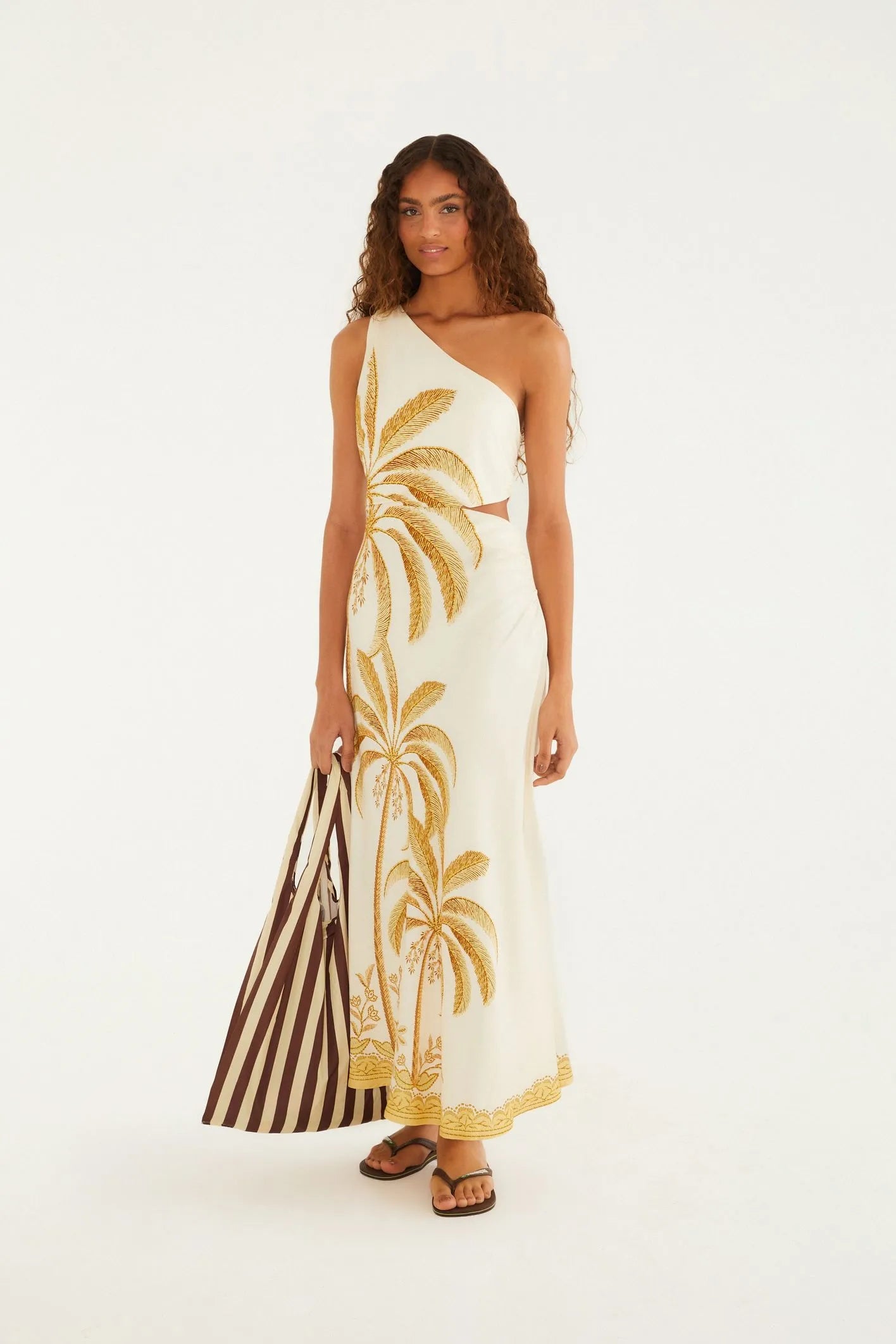 vestido ombro só estampado paisagem tropical. traz um design assimétrico com ombro à mostra, exalando frescor e originalidade. a peça fluida e de caimento leve é perfeita para dias ensolarados, permitindo movimento e conforto. aposte em ocasiões casuais ou eventos ao ar livre. FARM RIO original - alto verão 26.