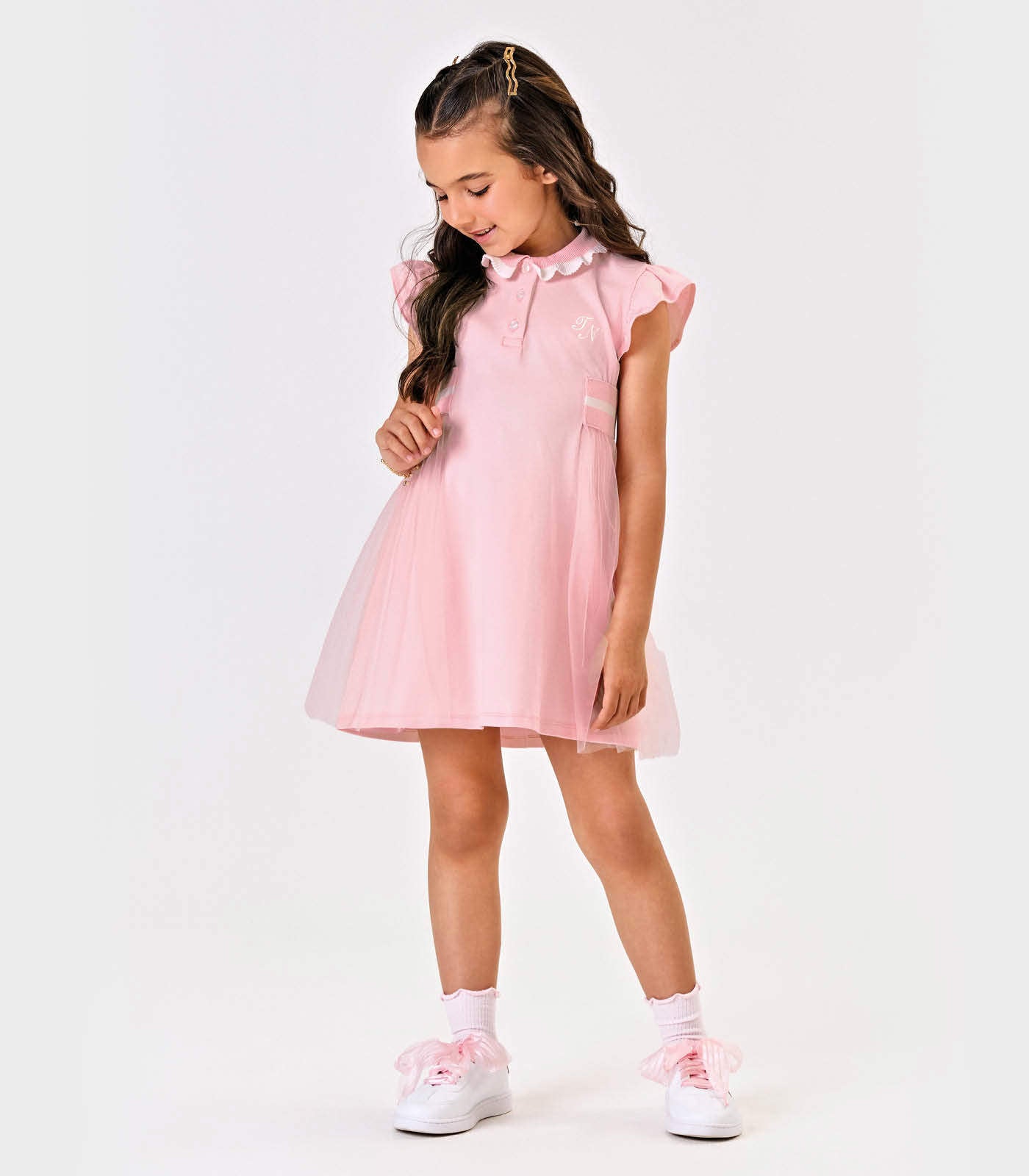 Este vestido polo, confeccionado em cotton leve na delicada cor rosa claro, traz um toque de suavidade e elegância ao seu guarda-roupa. O detalhe em tule realça a sofisticação da peça, proporcionando um visual harmonioso e moderno para ocasiões variadas com estilo refinado.